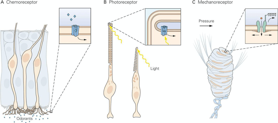 Sensory receptors are specialized to transduce a particular type of stimulus energy into electrical signals. Sensory receptors are classified as chemoreceptors, photoreceptors, or mechanoreceptors depending on the class of stimulus energy that excites them. They transform that energy into an electrical signal that is transmitted along pathways that serve one sensory modality. The insets in each panel illustrate the location of the ion channels that are activated by stimuli.